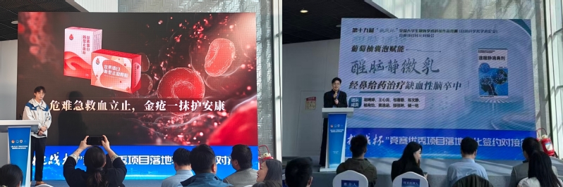 我校主体赛2项参赛作品:《急救特战“金疮药”的研发与应用》《醒脑通途——葡萄柚囊泡赋能醒脑静微乳经鼻给药治疗缺血性脑卒中》受邀作为全国11支获奖团队代表,在本届“挑战杯”竞赛优秀项目落地转化签约对接会上进行路演展示,受到众多创投机构、技术经理人的高度肯定与关注。