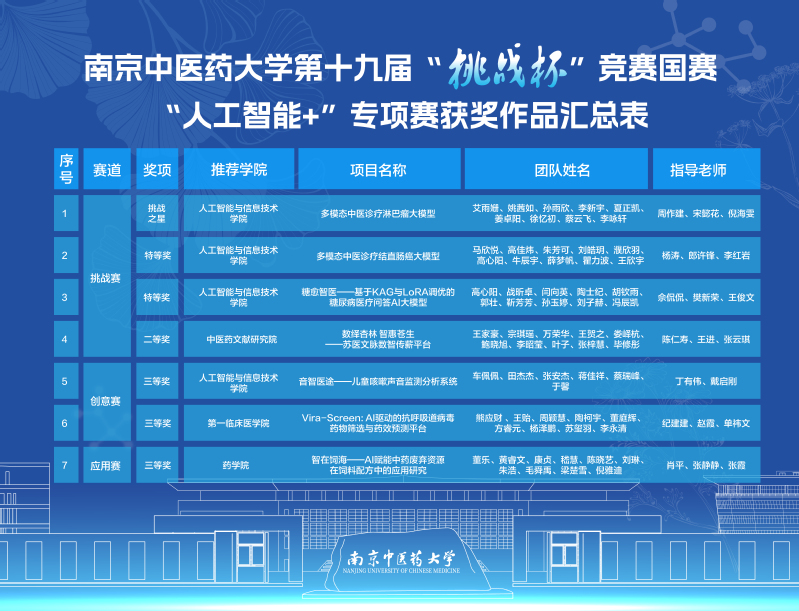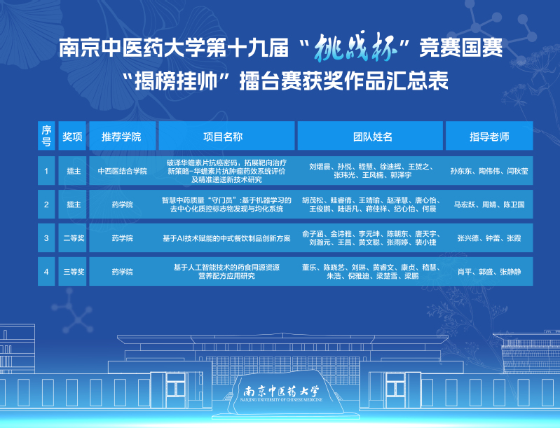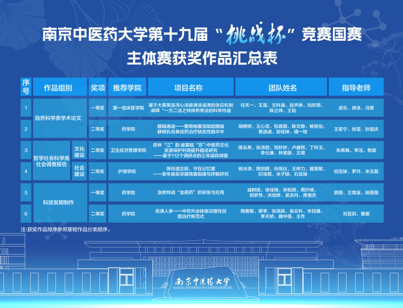 校团委通过“揭榜挂帅”“标志性成果滚动激励”等项目培育机制,压实“院系初赛-校内复赛-省级决赛-国赛终评”选拔培优责任,多渠道广泛宣传赛事,深入进行专项工作对接,扎实推进大学生科创项目落地转化的“后半篇文章”。全体参赛团队聚焦主干学科优势特色,开展“中医药+”科研攻关,历经一年多的调研打磨、模拟答辩与成果优化,在全国决赛终评舞台上以精准的项目展示、流畅的答辩阐述和扎实的科研学术功底,充分展现了我校青年学子“敢闯敢创”的精神风貌,彰显了我校在中医药拔尖创新人才培育和学生创新创业教育能力建设方面的深厚积累与卓越实力。