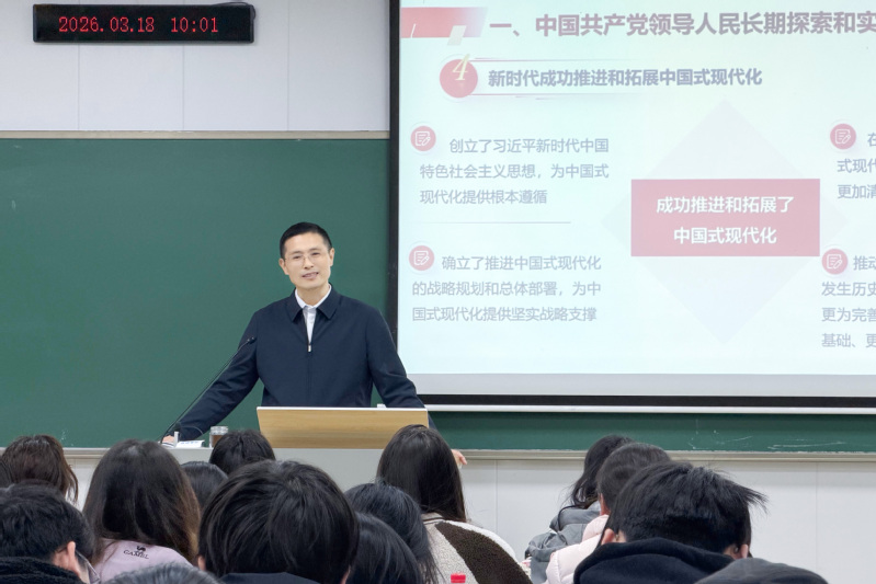3月18日上午,在习近平总书记主持召开学校思想政治理论课教师座谈会并发表重要讲话七周年这个特殊日子,校党委书记乔学斌走上讲台,以《习近平新时代中国特色社会主义思想概论》第二章“以中国式现代化全面推进中华民族伟大复兴”为主题,为中药学2024级本科生讲授了一堂精彩生动的思想政治理论课。授课现场乔学斌结合刚刚闭幕的2026年全国两会精神,围绕中华民族伟大复兴的历史进程、中国式现代化的道路选择、推进中国式现代化的实践要求三个维度展开系统深入地讲解。在讲授中华民族伟大复兴的历史进程时,乔学斌从中华文明五